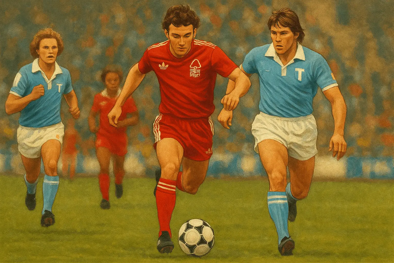 In midfield, the conductor was John McGovern, Clough’s eternal captain, quiet but commanding. Alongside him, the relentless Ian Bowyer added drive and goals from deep, while Martin O’Neill, cerebral and tireless, connected lines with elegance.